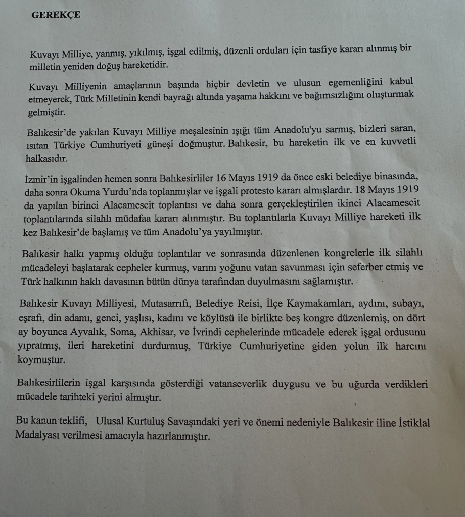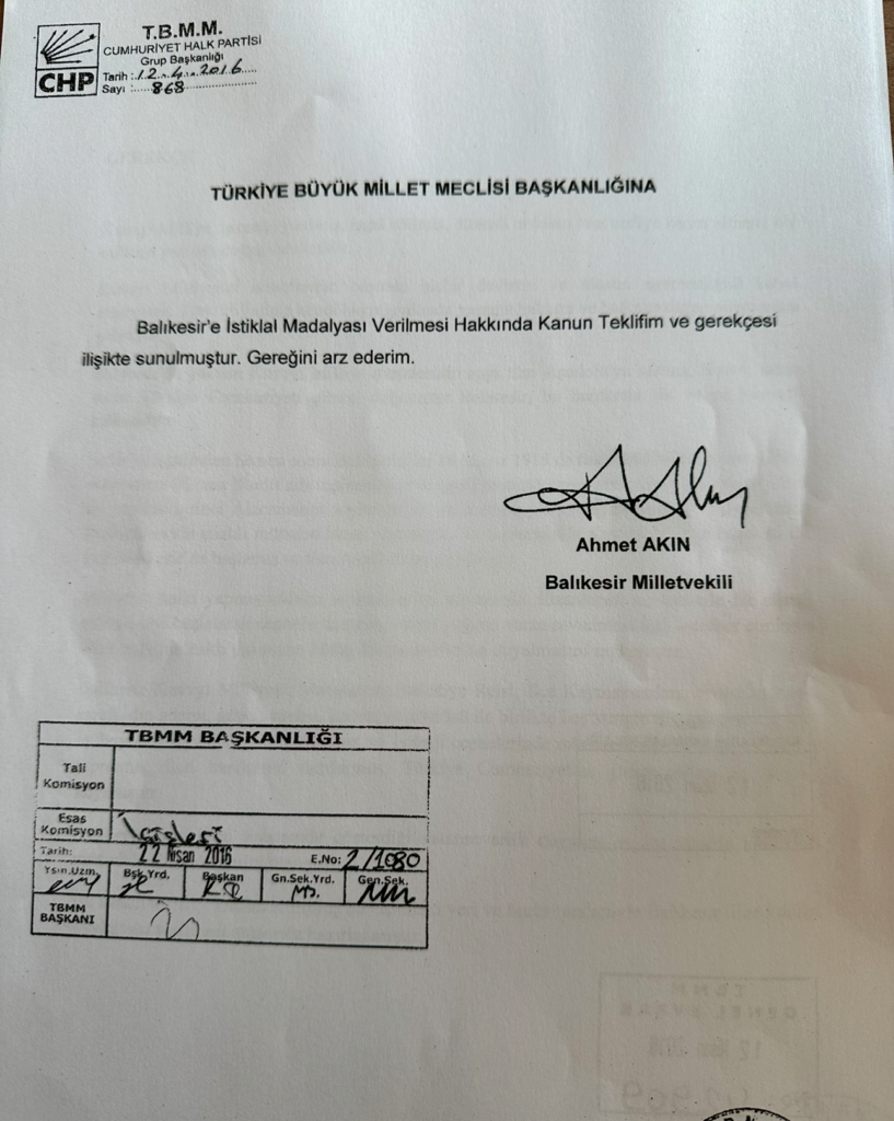 10 yıllık milletvekilliği sürecinde Balıkesir’e İstiklal Madalyası verilmesi hakkında 12 Nisan 2016 ve 24 Mayıs 2019 tarihlerinde Türkiye Büyük Millet Meclisine (TBMM) kanun teklifleri sunan Başkan Akın, Balıkesir Büyükşehir Belediye Başkanı olarak göreve başlar başlamaz ilk meclis toplantısında da “İstiklal Madalyası, Balıkesir’in hak ettiği bir onurdur” diyerek kararlılığını vurgulamıştı. Kuvayımilliye’nin başkenti Balıkesir’e bu tarihi onurun verilmesinin artık gecikmemesi gerektiğini vurgulayan Başkan Akın, siyaset üstü bir tavırla kentin tüm bileşenlerinin ortak hareket etmesi gerektiğini dile getirdi.