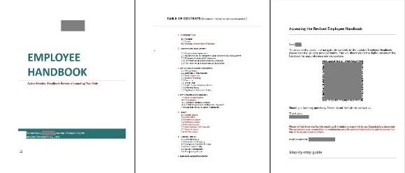 Güncellenmiş “Çalışan El Kitabı” gibi görünen ekteki belge gerçek bir kılavuz içermiyor. Sadece bir başlık sayfası, sözde değiştirilen maddelerin kırmızıyla vurgulandığı bir içindekiler tablosu, sözde belgenin tamamına gitmek için bir QR kodu içeren bir sayfa ve bir telefon kullanarak QR kodlarının nasıl okunacağına dair genel talimatlar yer alıyor. Belgede bu belgenin özellikle kendileri için oluşturulduğuna ikna etmek için kurbanın adı birçok kez yer alıyor.