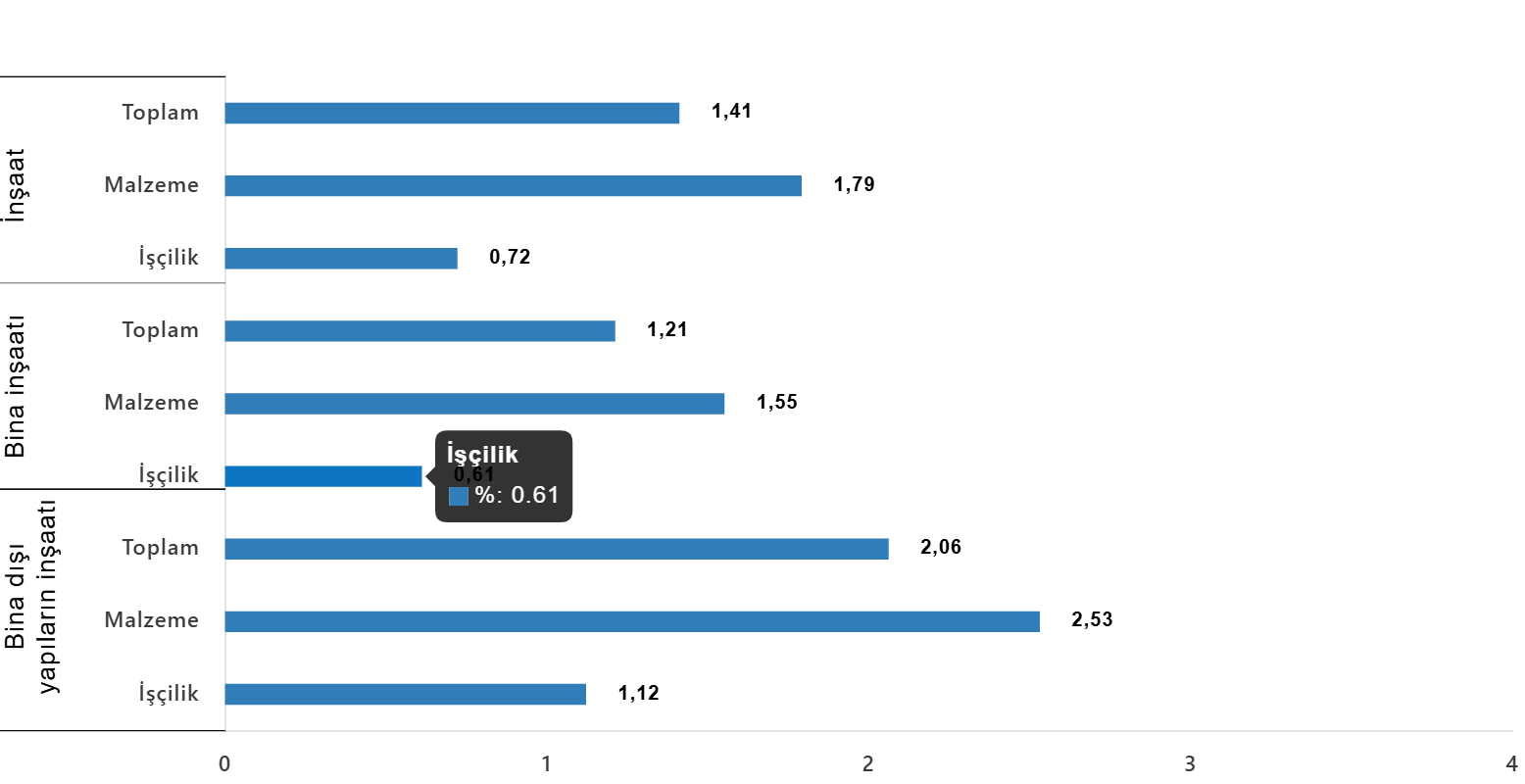 Bina inşaatı maliyet endeksi, bir önceki aya göre %1,21 arttı, bir önceki yılın aynı ayına göre %22,81 arttı. Bir önceki aya göre malzeme endeksi %1,55 arttı, işçilik endeksi %0,61 arttı. Ayrıca bir önceki yılın aynı ayına göre malzeme endeksi %18,90 arttı, işçilik endeksi %30,35 arttı.