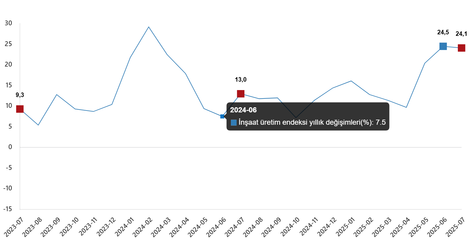 İnşaatın alt sektörleri (2021=100 referans yıllı) incelendiğinde, 2025 yılı Temmuz ayında bina inşaatı sektörü endeksi bir önceki yılın aynı ayına göre %26,2 arttı, bina dışı yapıların inşaatı sektörü endeksi %16,4 arttı ve özel inşaat faaliyetleri sektörü endeksi %22,6 arttı.
