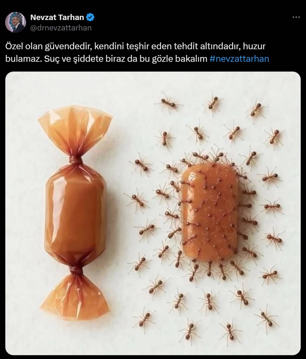 Tarhan, “Kendisini teşhir eden tehdit altındadır” açıklamasının kadınlara yönelik olarak yorumlanmasının ardından üzgün olduğunu belirtti. Nevzat Tarhan, X ve Instagram hesaplarından yaptığı bir paylaşımla sosyal medyada gündeme geldi. Tarhan’ın, “Özel olan güvendedir, kendini teşhir eden tehdit altındadır, huzur bulamaz. Suç ve şiddet olaylarına biraz da bu gözle bakalım” ifadelerini kullandığı paylaşımı çok sayıda tepkiye neden oldu.