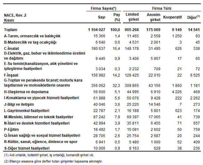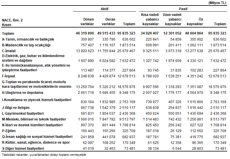 İmalat sektörü 25 trilyon 676 milyar 467 milyon TL aktif büyüklüğü ile tüm sektörler arasında ilk sırada geldi. Aktif büyüklüğünde ikinci sırayı 18 trilyon 576 milyar 976 milyon TL ile toptan ve perakende ticaret; motorlu kara taşıtlarının ve motosikletlerin onarımı sektörü aldı. Öz kaynaklar bakımından imalat sektörü 13 trilyon 277 milyar 638 milyon TL ile ilk sırada yer alırken, onu sırasıyla 7 trilyon 351 milyar 87 milyon TL ile toptan ve perakende ticaret; motorlu kara taşıtlarının ve motosikletlerin onarımı sektörü, 7 trilyon 256 milyar 881 milyon TL ile de mesleki, bilimsel ve teknik faaliyetler sektörü takip etti.