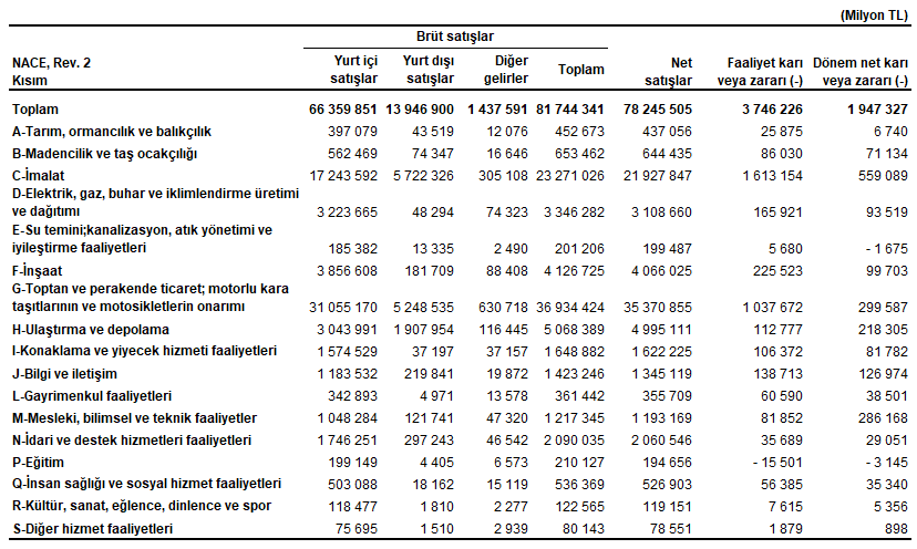 Firmaların toplulaştırılmış gelir tablosu verisine göre, 2024 yılında tüm sektörlerin toplulaştırılmış dönem net karı 1 trilyon 947 milyar 327 milyon TL olarak gerçekleşti. İmalat sektörü 559 milyar 89 milyon TL ile en yüksek net kar elde eden sektör oldu. Toptan ve perakende ticaret; motorlu kara taşıtlarının ve motosikletlerin onarımı sektörü 299 milyar 587 milyon TL, mesleki, bilimsel ve teknik faaliyetler sektörü ise 286 milyar 168 milyon TL net kar elde etti. Eğitim sektörü 2024 yılını 3 milyar 145 milyon TL, su temini; kanalizasyon, atık yönetimi ve iyileştirme faaliyetleri sektörü ise 1 milyar 675 milyon TL net zarar ile tamamladı.