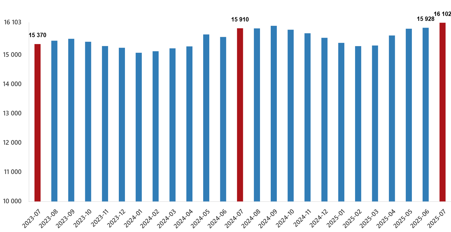 Sanayi, inşaat ve ticaret-hizmet sektörleri toplamında ücretli çalışan sayısı 2025 Temmuz ayında bir önceki yılın aynı ayına göre %1,2 arttı. Ücretli çalışan sayısı bir önceki yılın aynı ayında 15 milyon 910 bin 286 kişi iken, 2025 yılı Temmuz ayında 16 milyon 101 bin 724 kişi oldu.