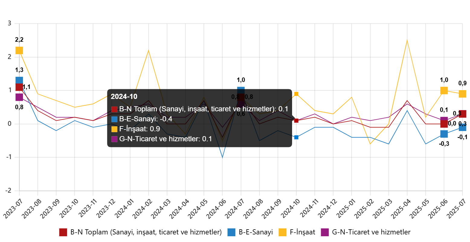 Ücretli çalışanların alt detaylarına bakıldığında; 2025 Temmuz ayında ücretli çalışanlar aylık olarak sanayi sektöründe %0,1 azaldı, inşaat sektöründe %0,9 arttı ve ticaret-hizmet sektöründe %0,3 arttı.